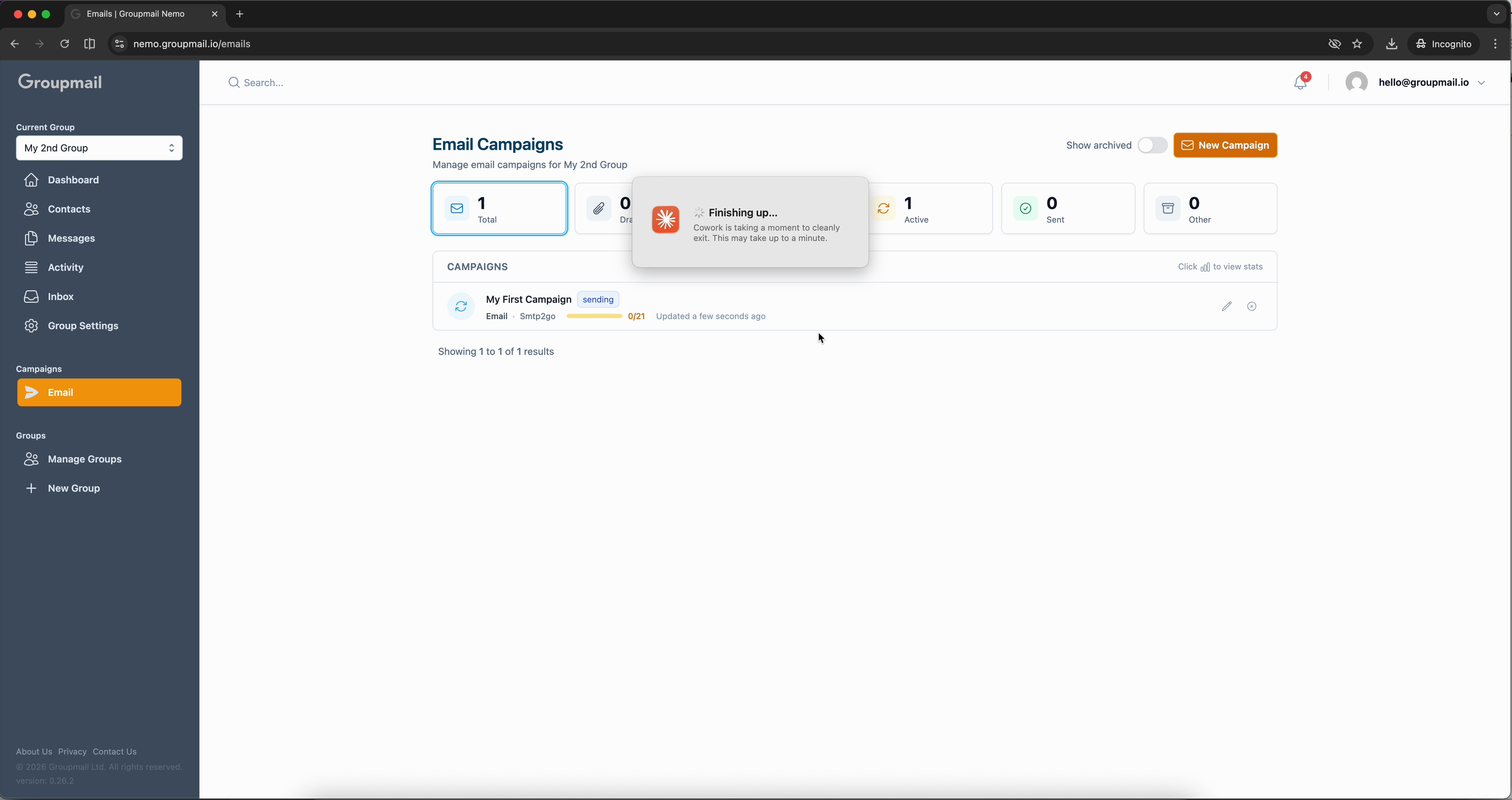 After clicking Send Now, you're taken to the Email Campaigns page. Your campaign appears with an active status and a progress bar showing how many emails have been delivered.