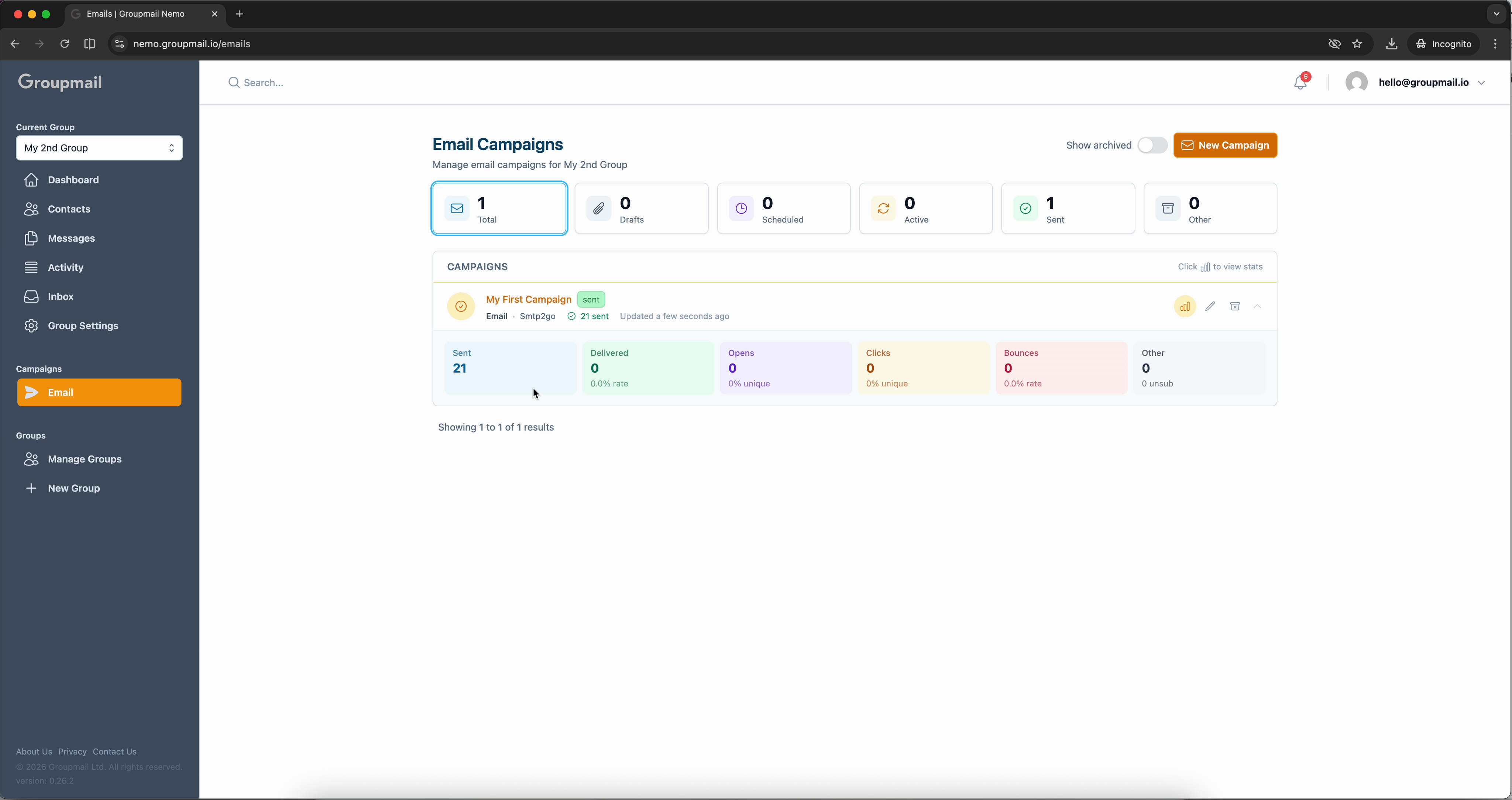 Once sending is complete, the campaign status changes to sent and you'll see full performance stats: sent count, delivered, opens, clicks, bounces, and more. These metrics update in real time as subscribers engage with your email.