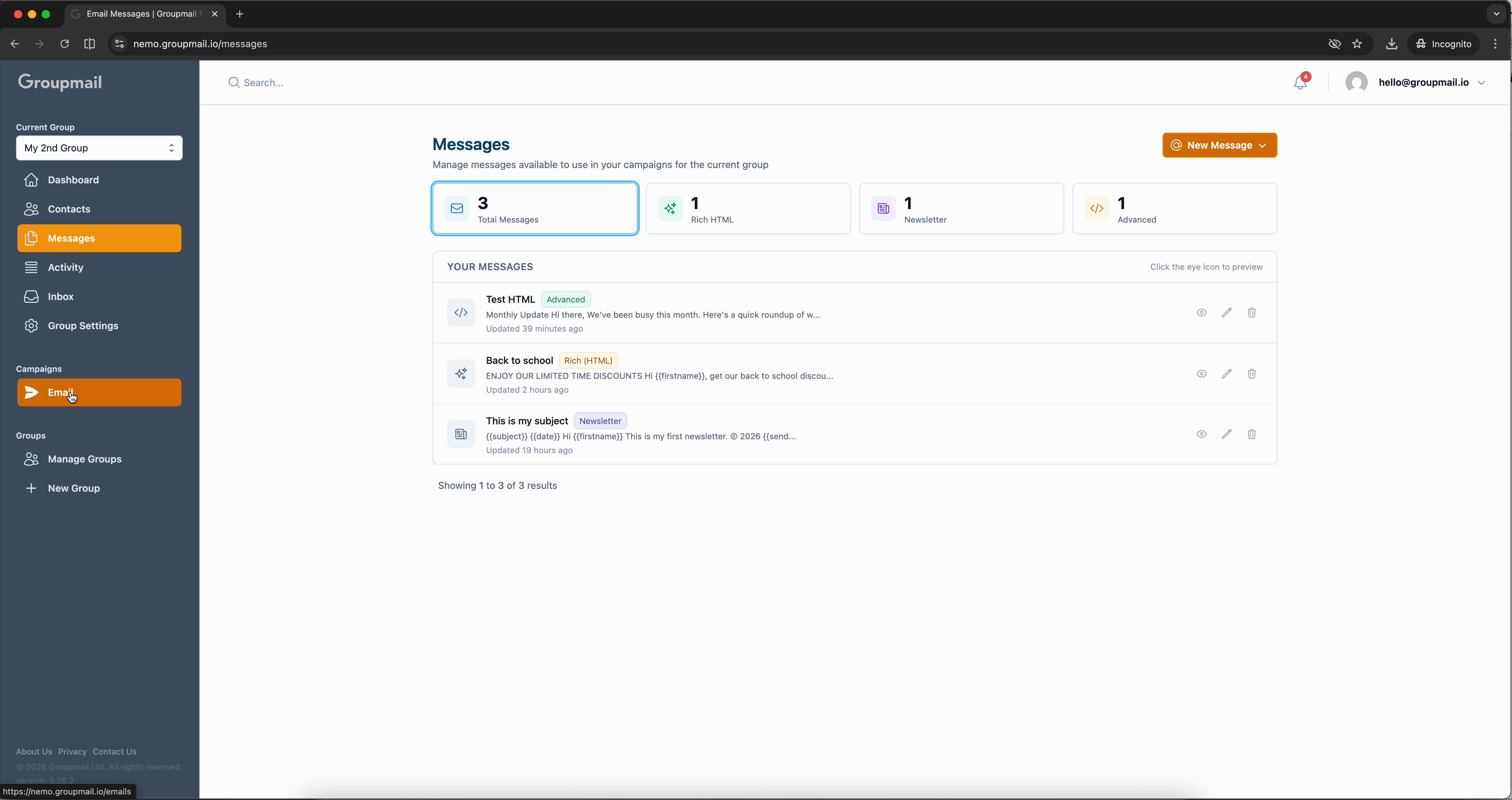 Once you've created a message — whether as a newsletter, from a template, or in the advanced editor — the next step is sending it as a campaign. The campaign wizard walks you through naming, audience selection, and delivery in three simple steps.
