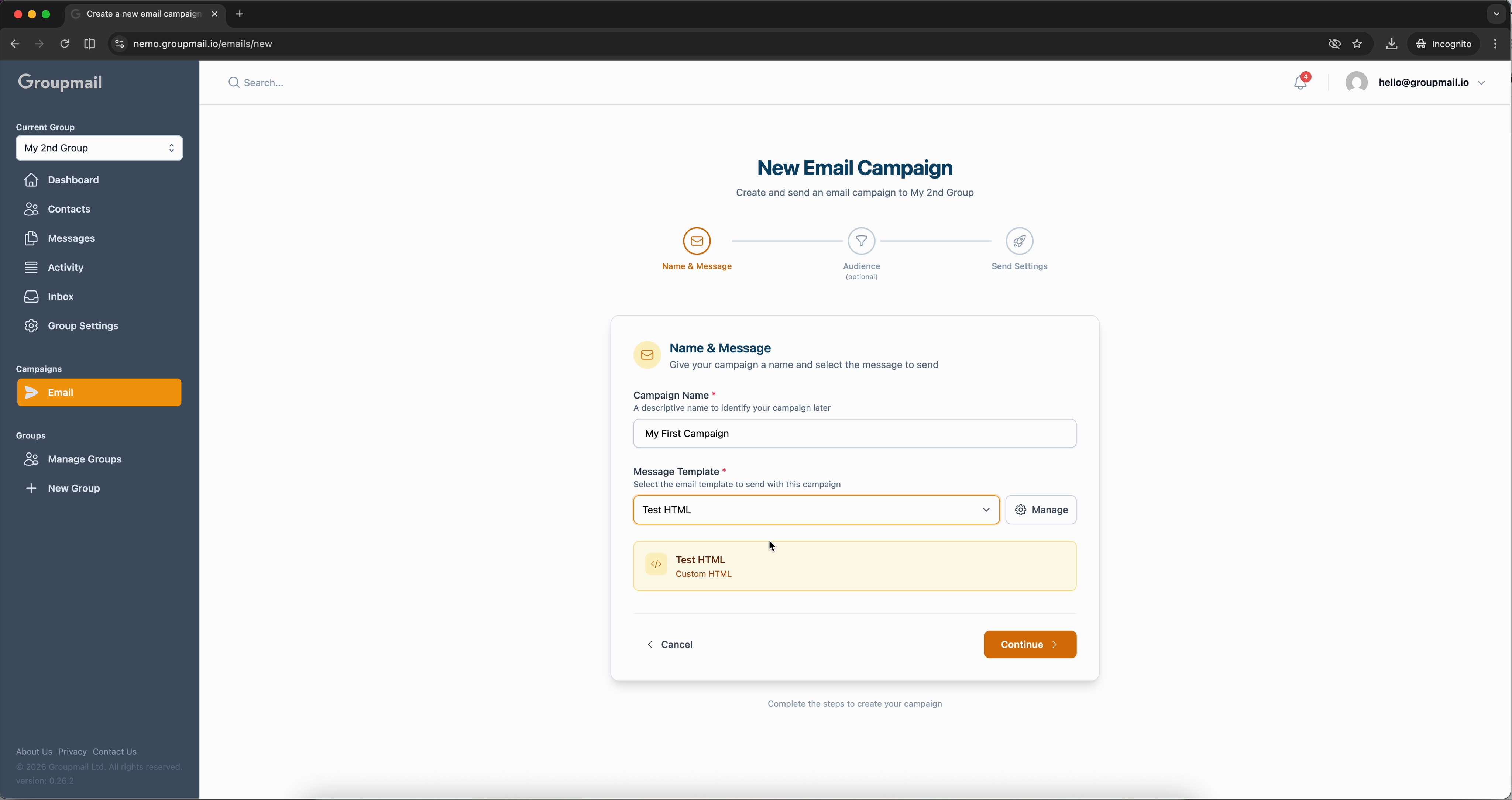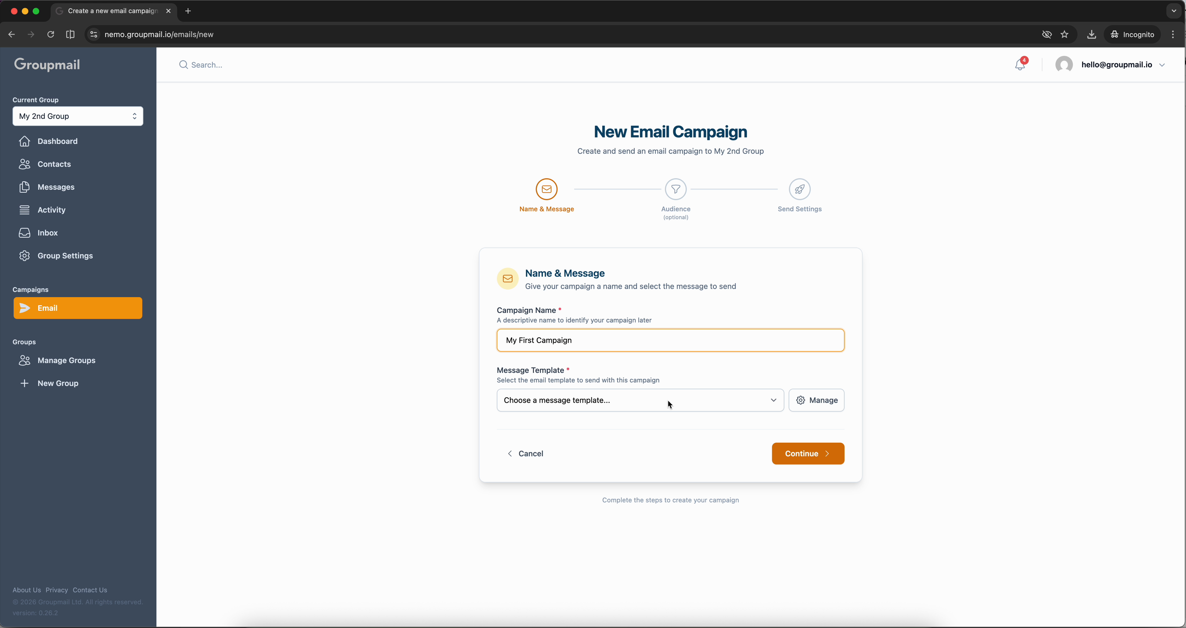 From the sidebar, click Email under Campaigns, then click New Campaign. The wizard opens with a progress bar showing three steps: Name & Message, Audience, and Send Settings.