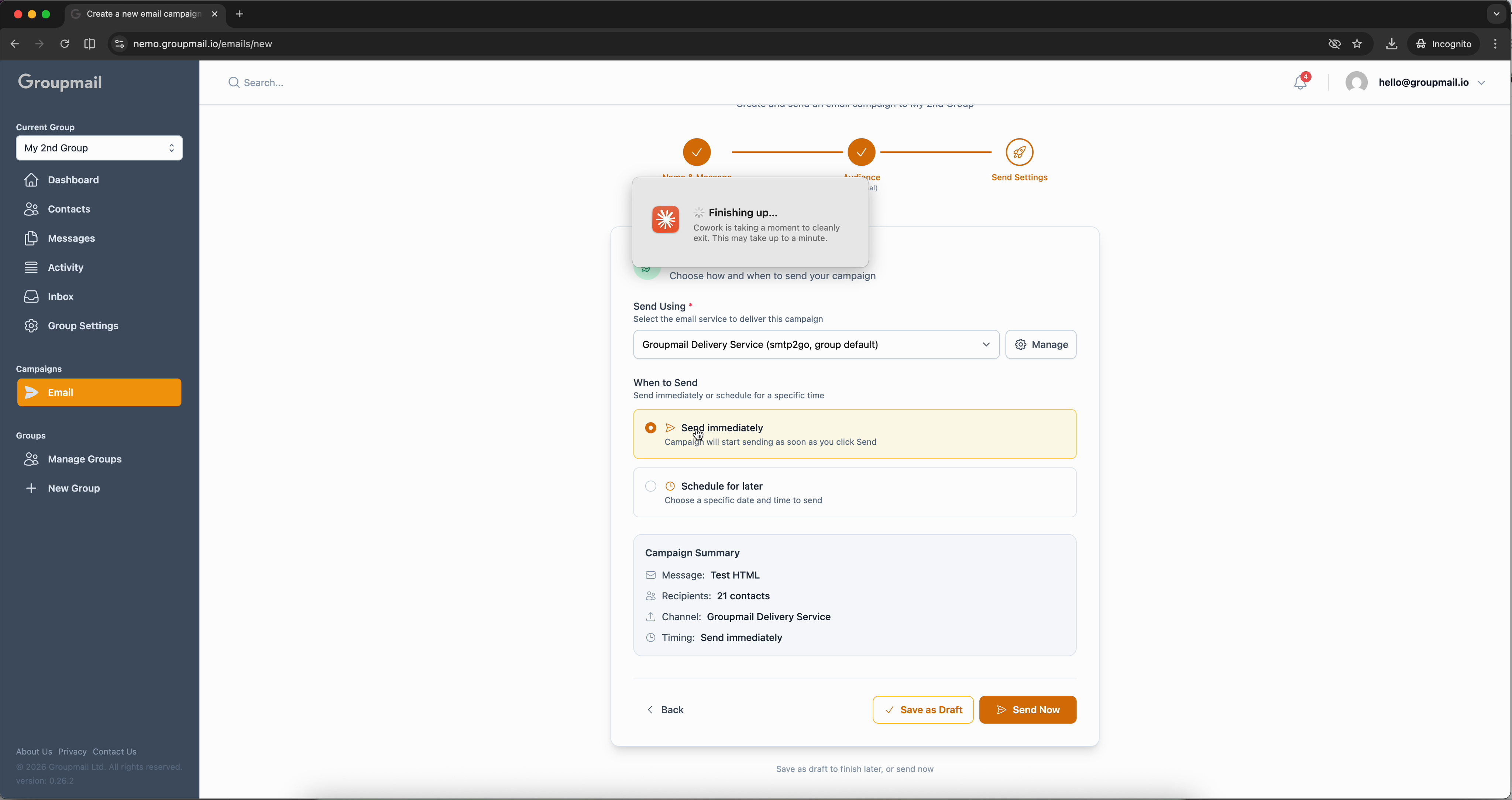 When everything looks right, click Send Now to launch your campaign, or Save as Draft to come back later.