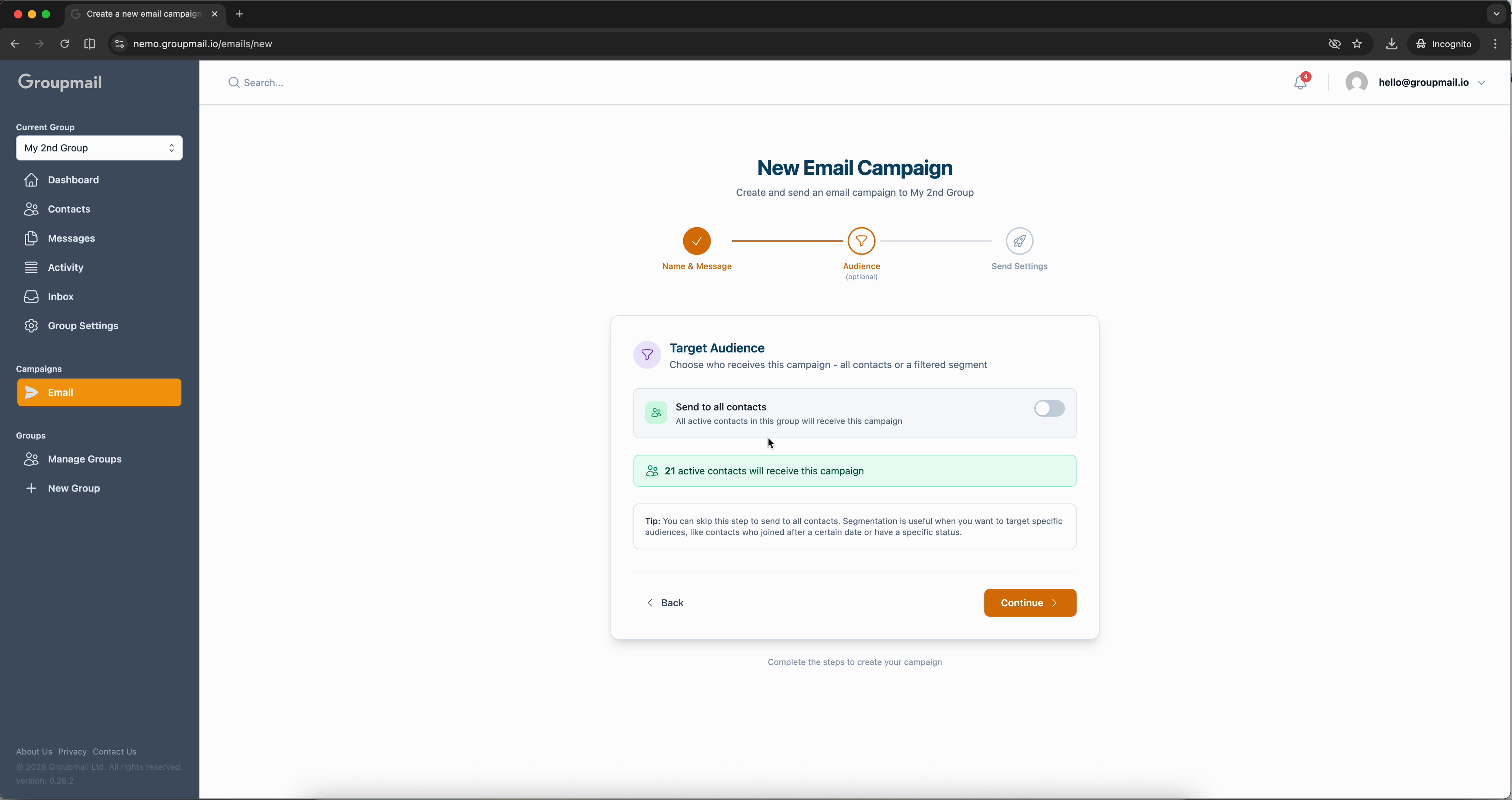 Click Continue to move to audience selection. By default, Send to all contacts is enabled, meaning every active contact in your group will receive the campaign. You'll see a green banner confirming the total number of recipients.