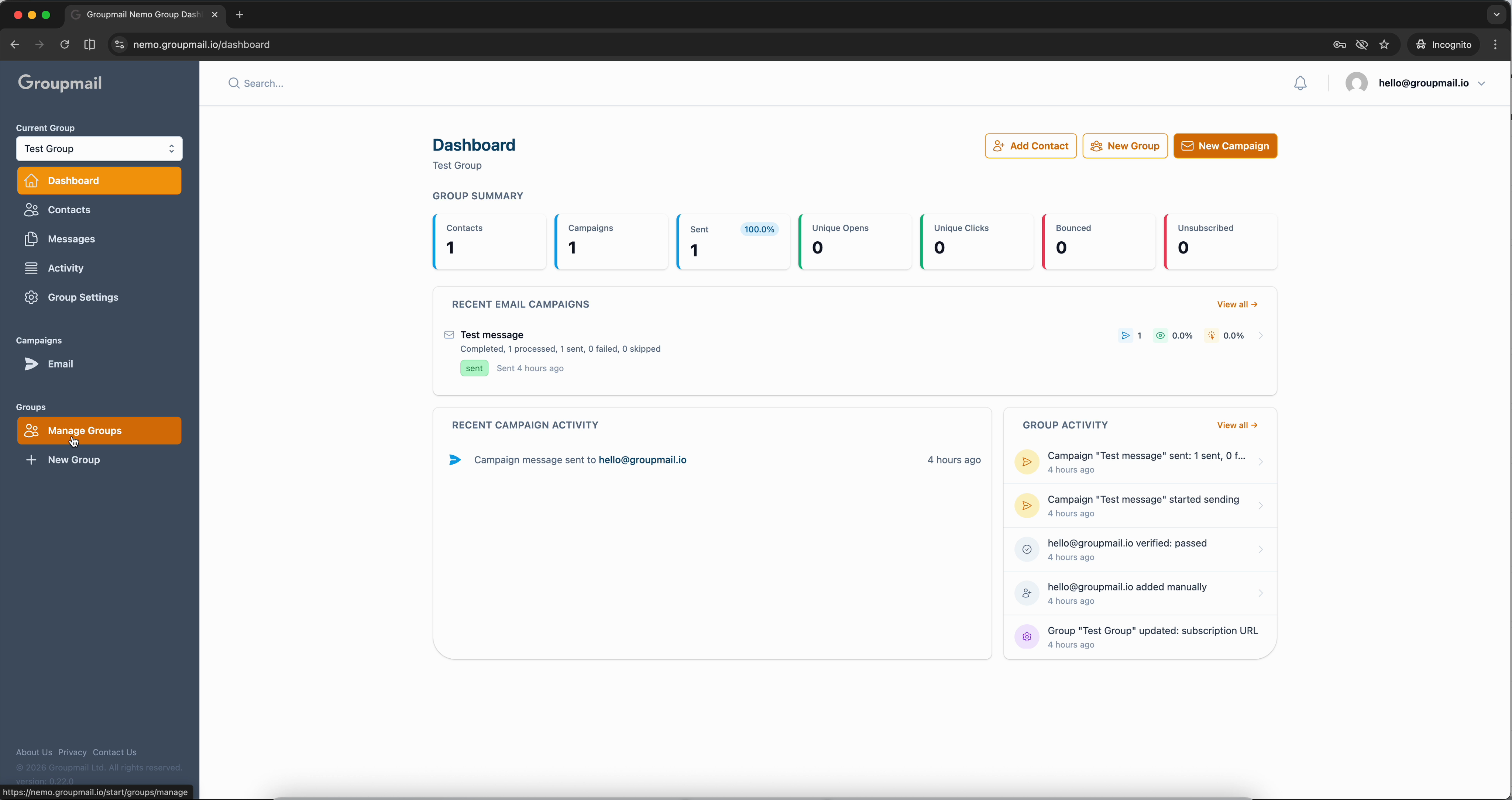 Groups are the building blocks of Groupmail. Each group has its own contacts, messages, campaigns, and sender identity — making it easy to manage multiple mailing lists from a single account.