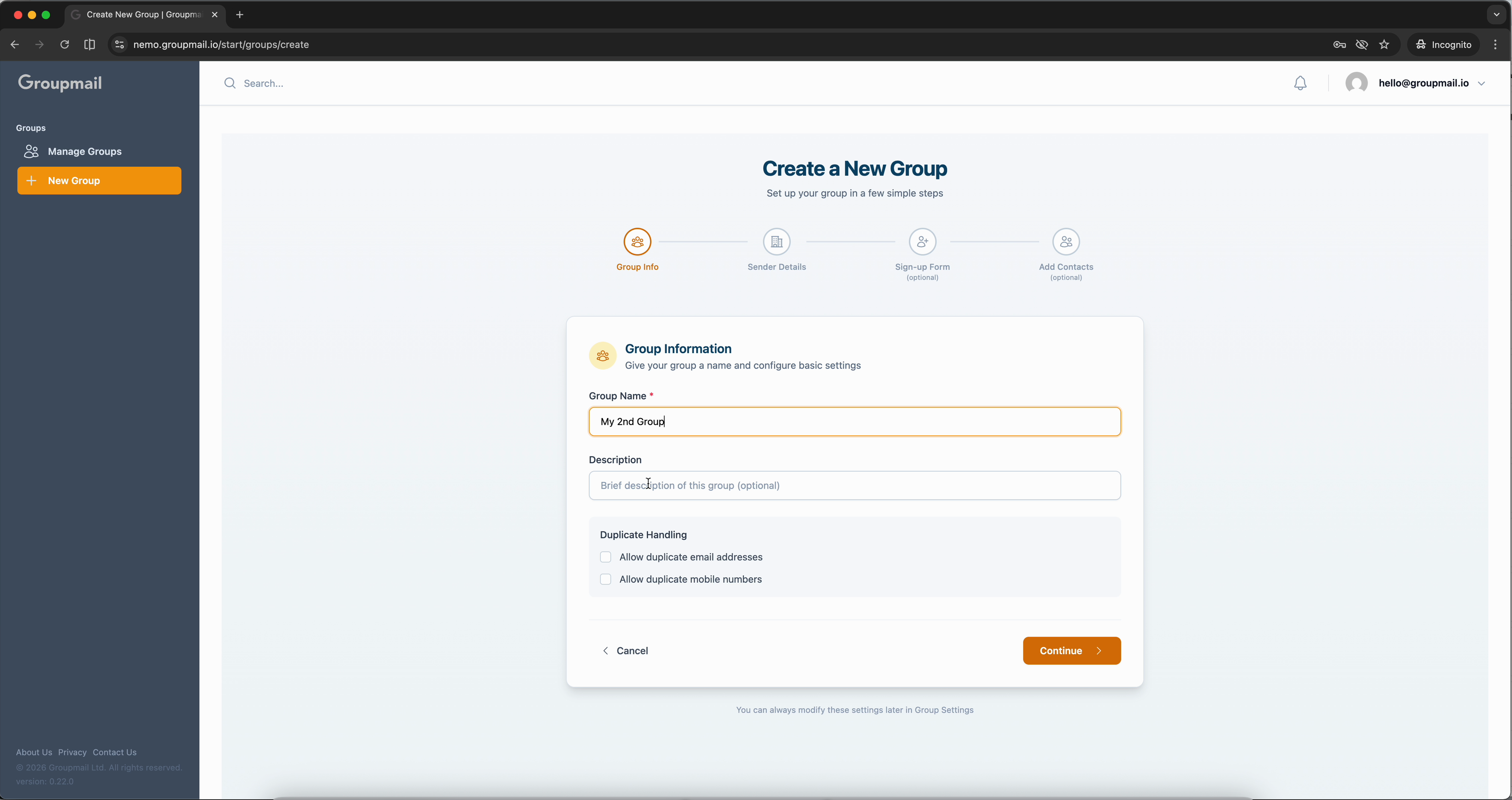 From any page in Groupmail, click Manage Groups in the sidebar under Groups, then click New Group. This opens the group creation wizard.