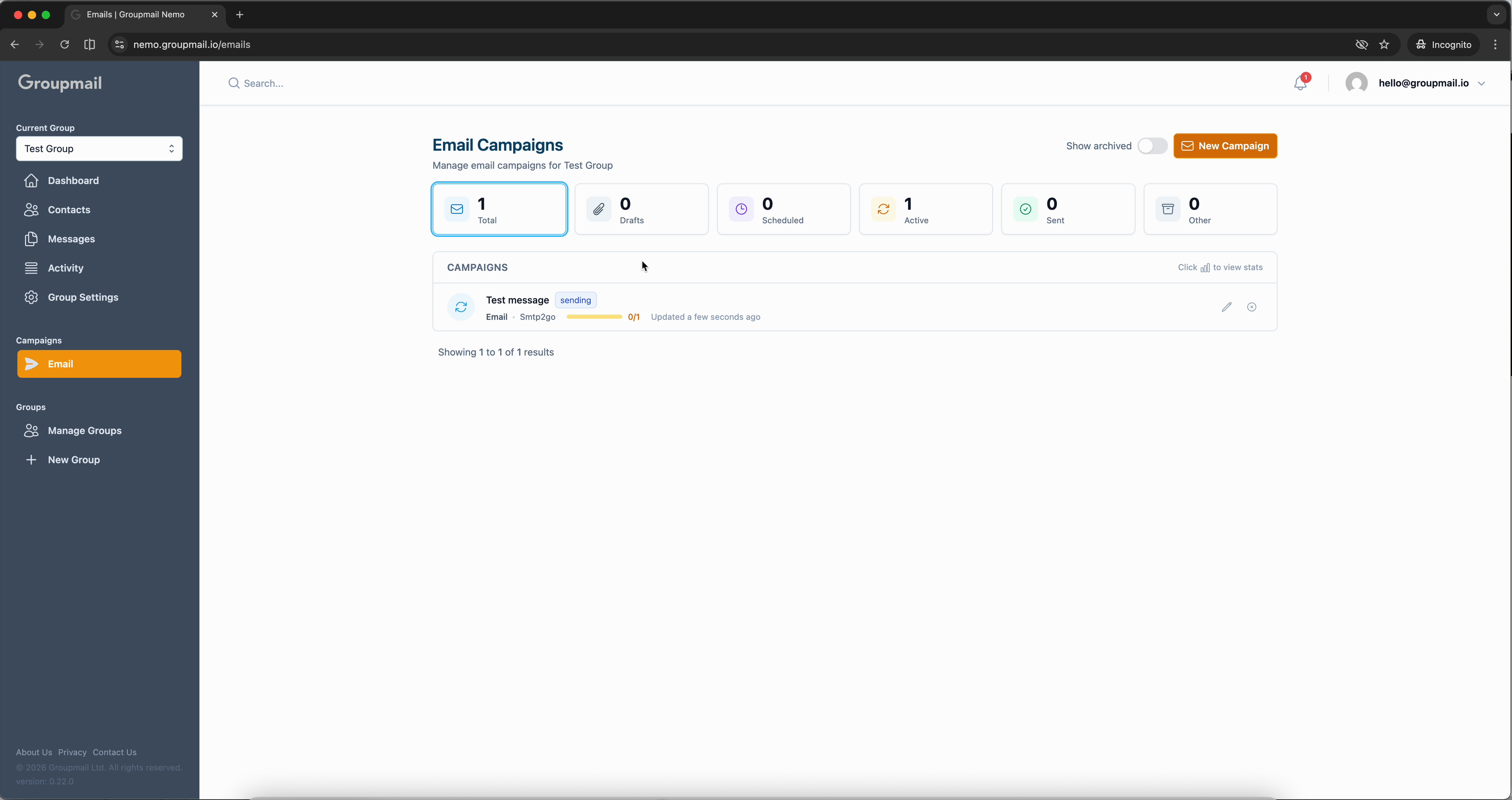 A group is the foundation of everything in Groupmail. It holds your contacts, messages, and campaigns together in one place. Think of it as a mailing list — you might have one for newsletter subscribers, another for VIP customers.