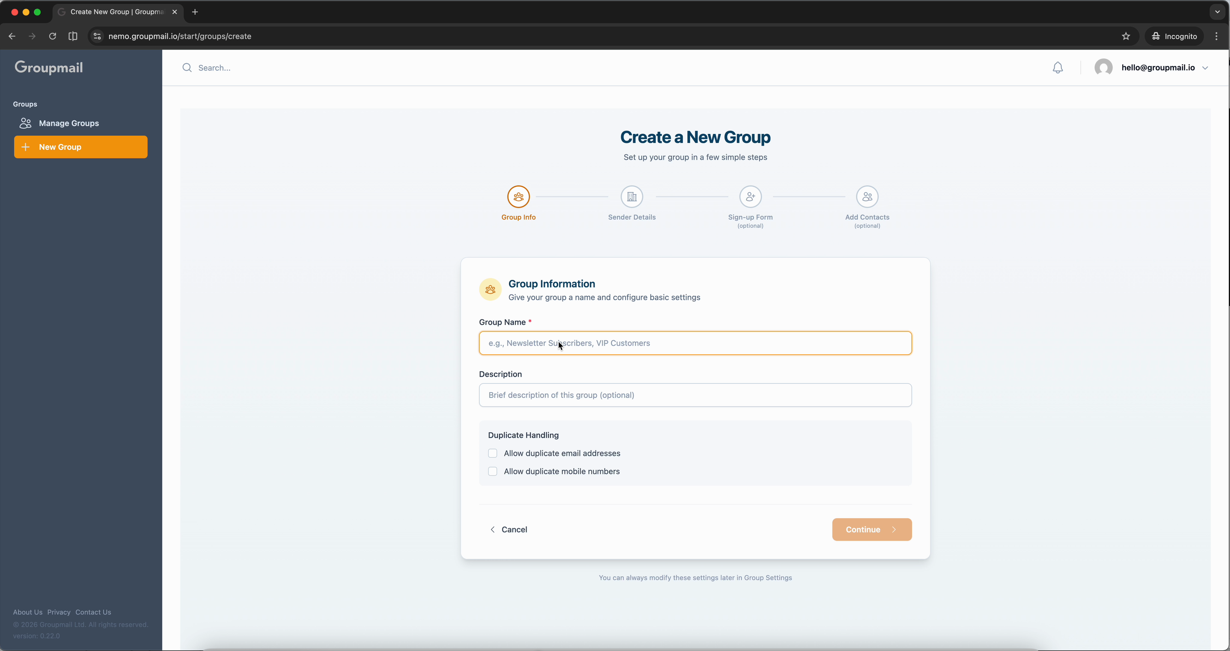 - Create a New Group — Organize contacts into multiple lists for targeted sending.