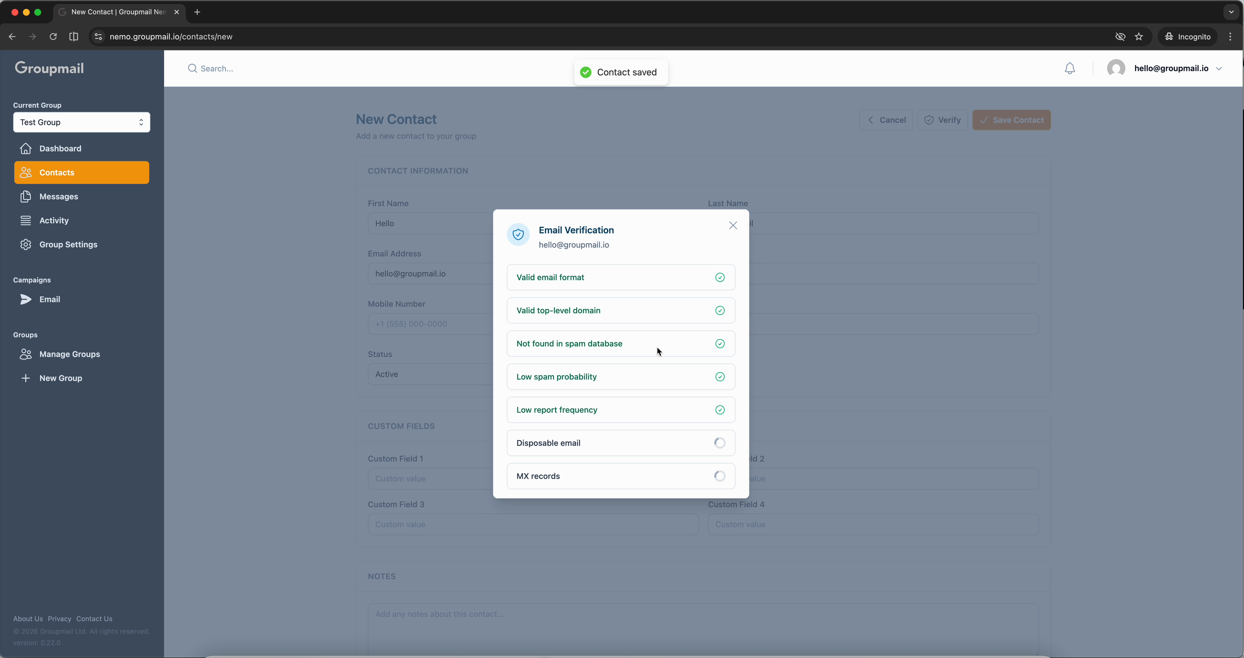 Click Add Contact and fill in a name and email address. When you save, Groupmail automatically verifies the email in real time — checking format, domain validity, spam databases, and MX records.