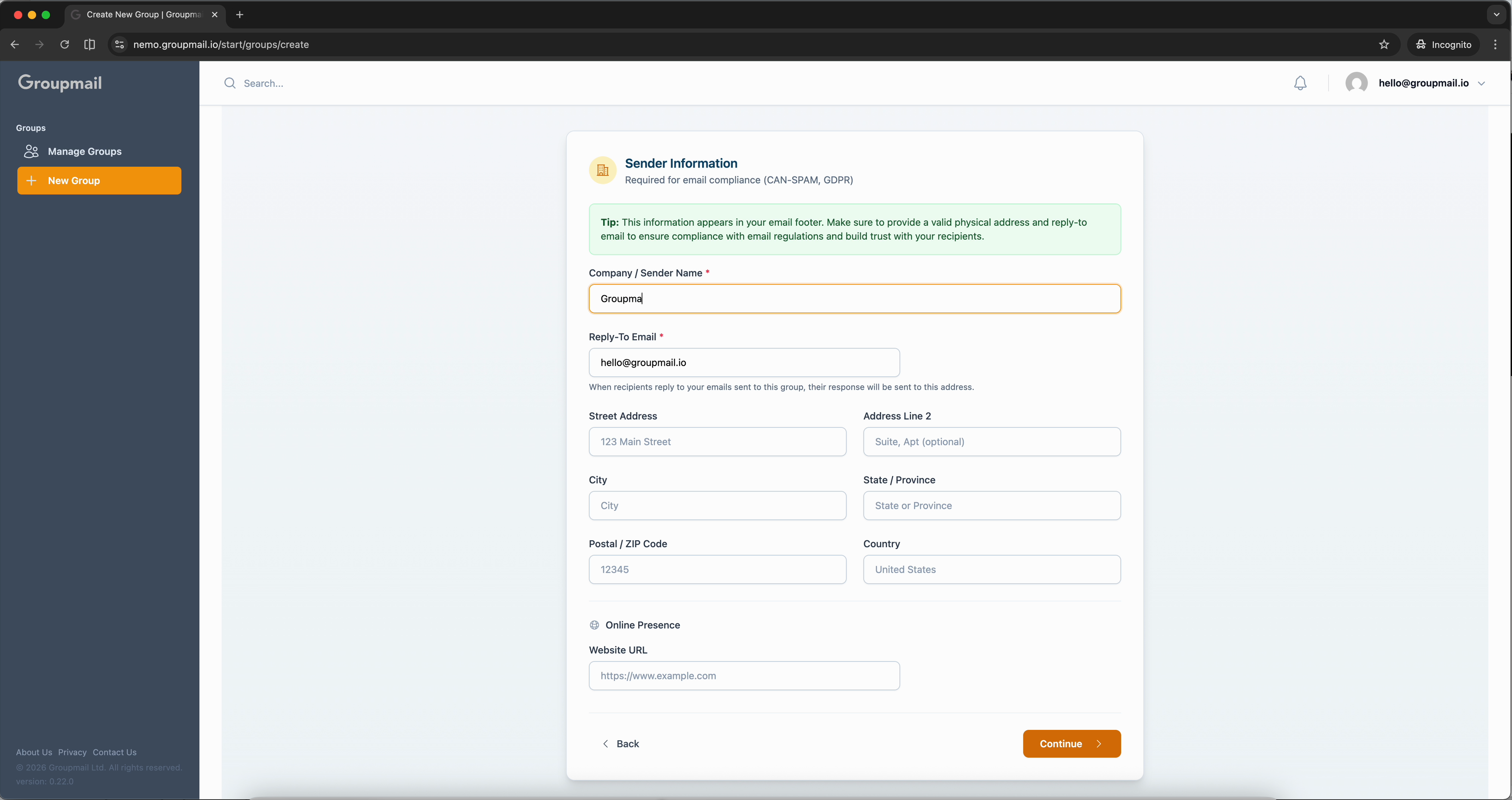 Fill in your company or sender name, reply-to email address, and a physical mailing address. This information appears in the footer of every email you send from this group.
