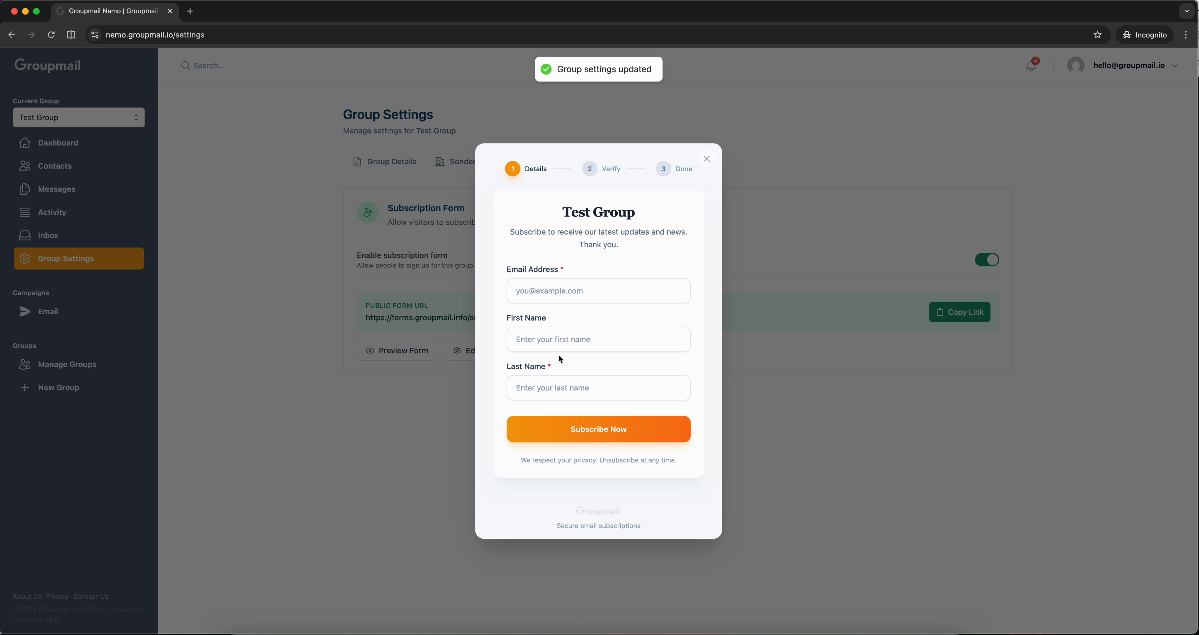 Every Groupmail group comes with a built-in subscription form that lets people sign up to receive your emails through a simple public link. Share it on your website, in social media bios, or anywhere you want to grow your audience.