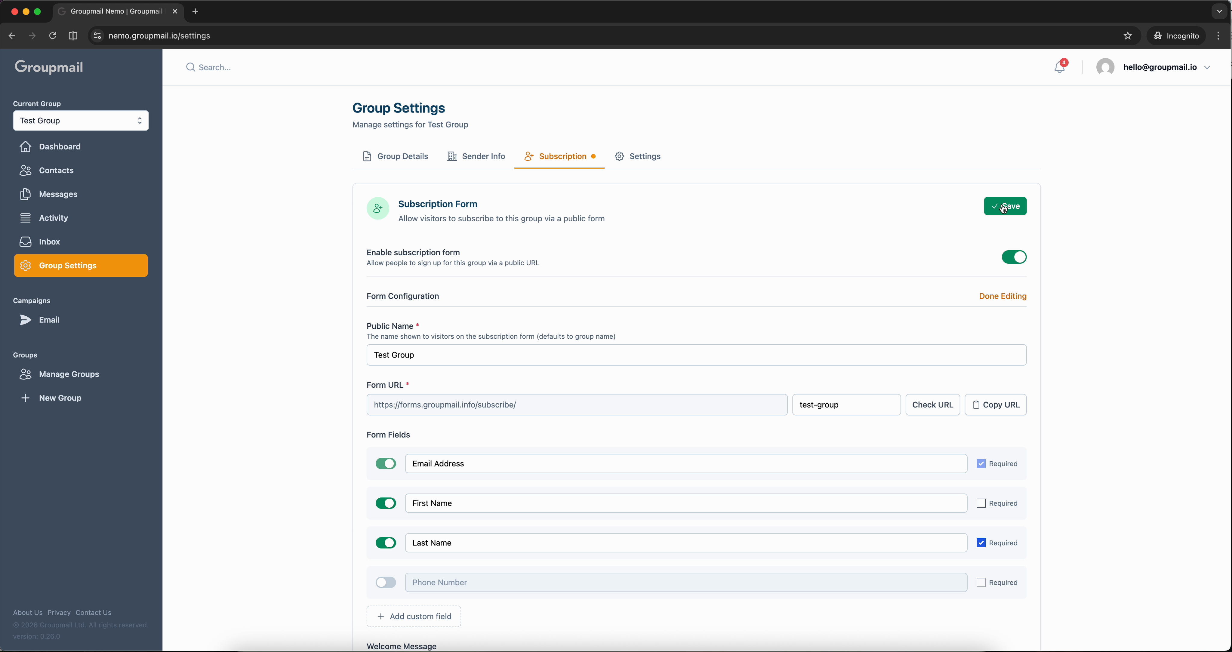 From the sidebar, click Group Settings, then select the Subscription tab. You'll see a toggle to enable the subscription form — it's off by default.